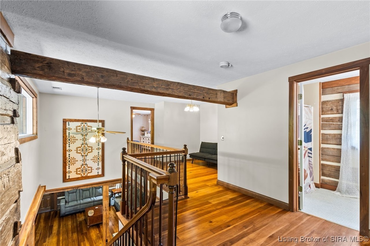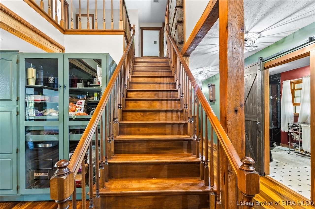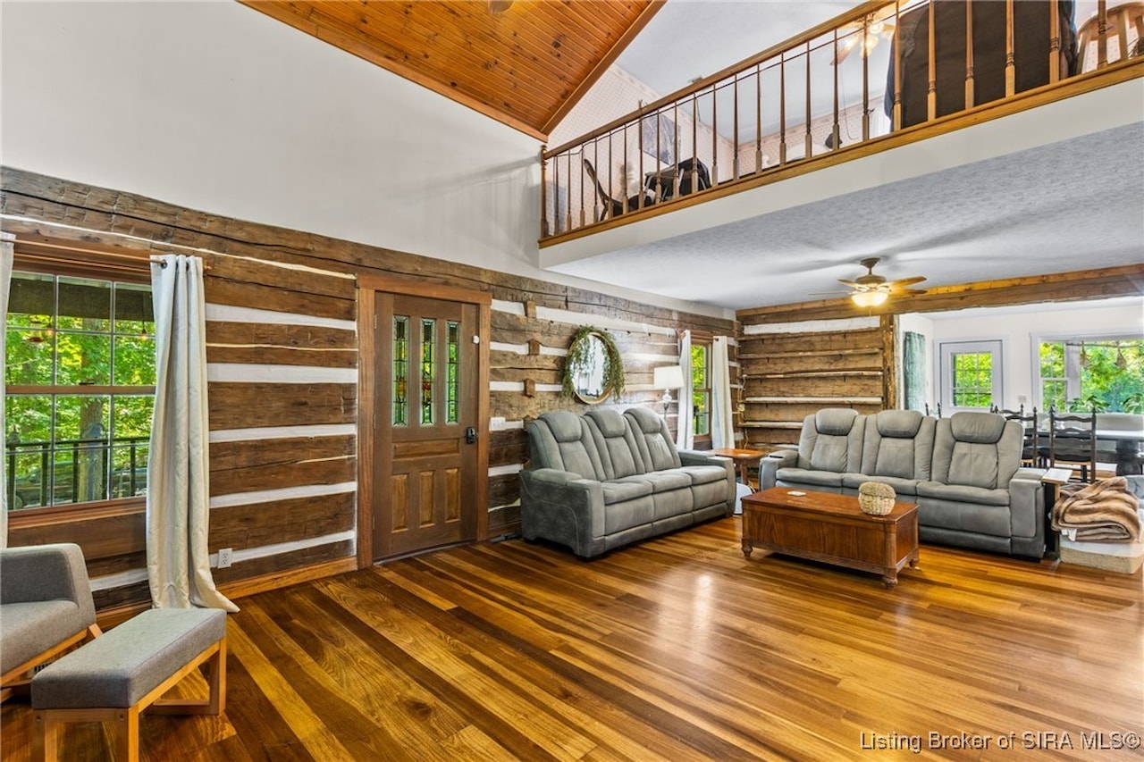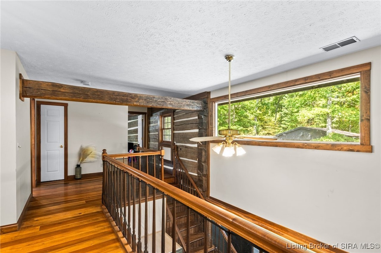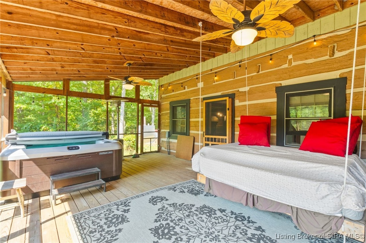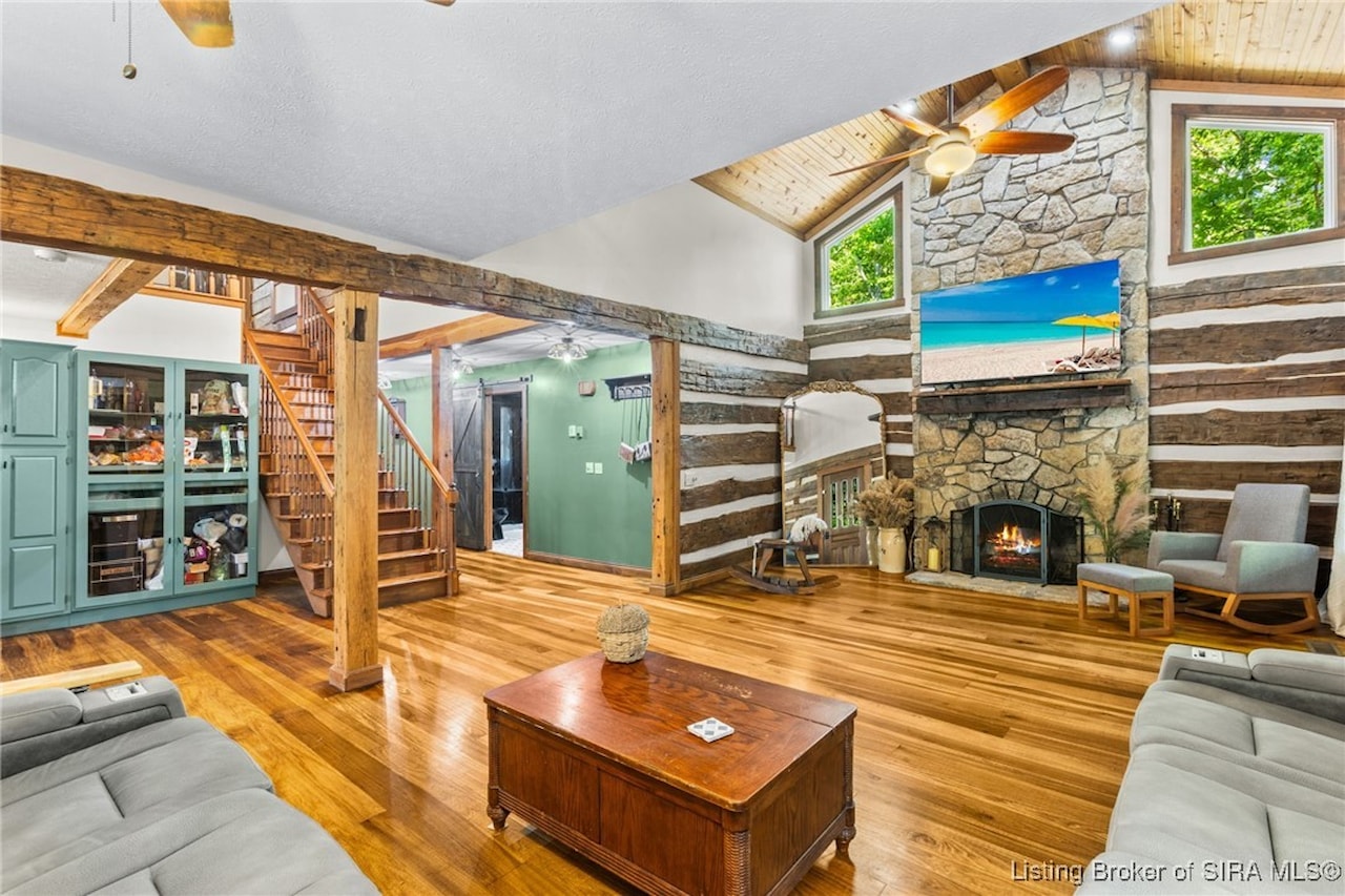 HOME FOR THE HOLIDAYS! You could be in this home before Christmas & no payment before 2026 if you hurry! Charming Log Cabin Retreat on 3.5+ Secluded, Wooded Ac w/Pond! Escape to rustic elegance in this beautiful log cabin, tucked away on a peaceful wooded lot with a private pond & dock. Located just off Grant Line Road (Hwy 60), this serene property offers both privacy & convenience under 20 mins to the interstate & less than 30 minutes to Louisville. Enjoy fishing, hiking, & hunting all on your own land. The open-concept great room features stunning hardwood floors, a dramatic two-story stone fireplace, & exposed beams. It flows seamlessly into the kitchen, which includes a center island & with the updated range/oven. The dining area w/bay window overlooks the pond, ideal for daily meals or entertaining. The main-level primary suite includes a spacious bath with double vanity and antique claw-foot tub. A full-length covered back porch provides tranquil views of the pond & woods. Upstairs, find 2 additional bedrooms (one in the loft), a full bath, & an office great for guests or remote work. Though built in 1991, the home features logs believed to date to the 1800s (per seller), blending historic charm with modern comfort. Updates include a newer HVAC (<2 years), water heater (~4 years), & roof (~8 years). A recently added third full bath on the main level offers added flexibility. Plenty of parking with a 1.5-car att. garage plus a 3-car detached garage. Sq ft /rm sz approx.